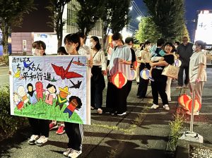 峡西ちょうちん平和行進は、7月25日の夜行われ、53人の参加でした。南アルプス市美術館をスタートし行進を行いました。